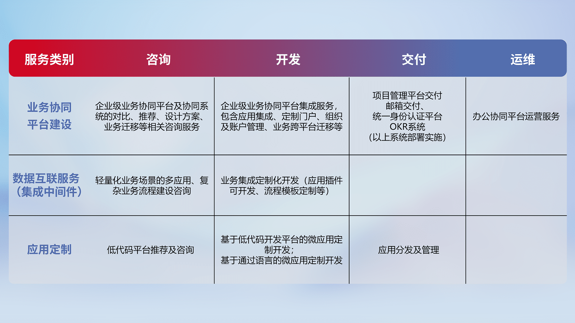 针对钉钉、、、企微、、、、IDaas等平台级产品提供产品的规划、、、方案、、、交付、、定制化开发等服务,,,,实现如统一协同办公、、、智能客户服务、、、混合会议管理、、、智能数据查询、、、等业务场景,,实现数字化转型。。。。
