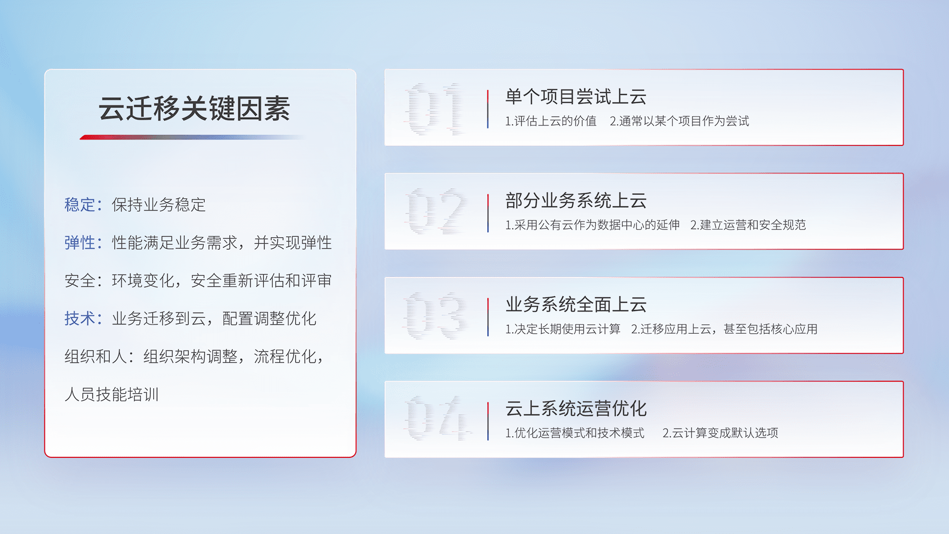 结合实际业务,,,从规划设计、、、云平台选型、、、云原生改造、、、、数据迁移、、、、集成交付,,迁移全过程为客户识别最佳上云路径,,做好风险识别管理,,,,设计网络架构、、、、身份权限、、、安全审计合规、、操作审计、、、、日志审计、、监控告警策略、、多站点容灾设计等,,,,对云上基础设施进行整体规划,,,提升IT治理水平,,以满足弹性、、高可用、、、高性能的需求。。