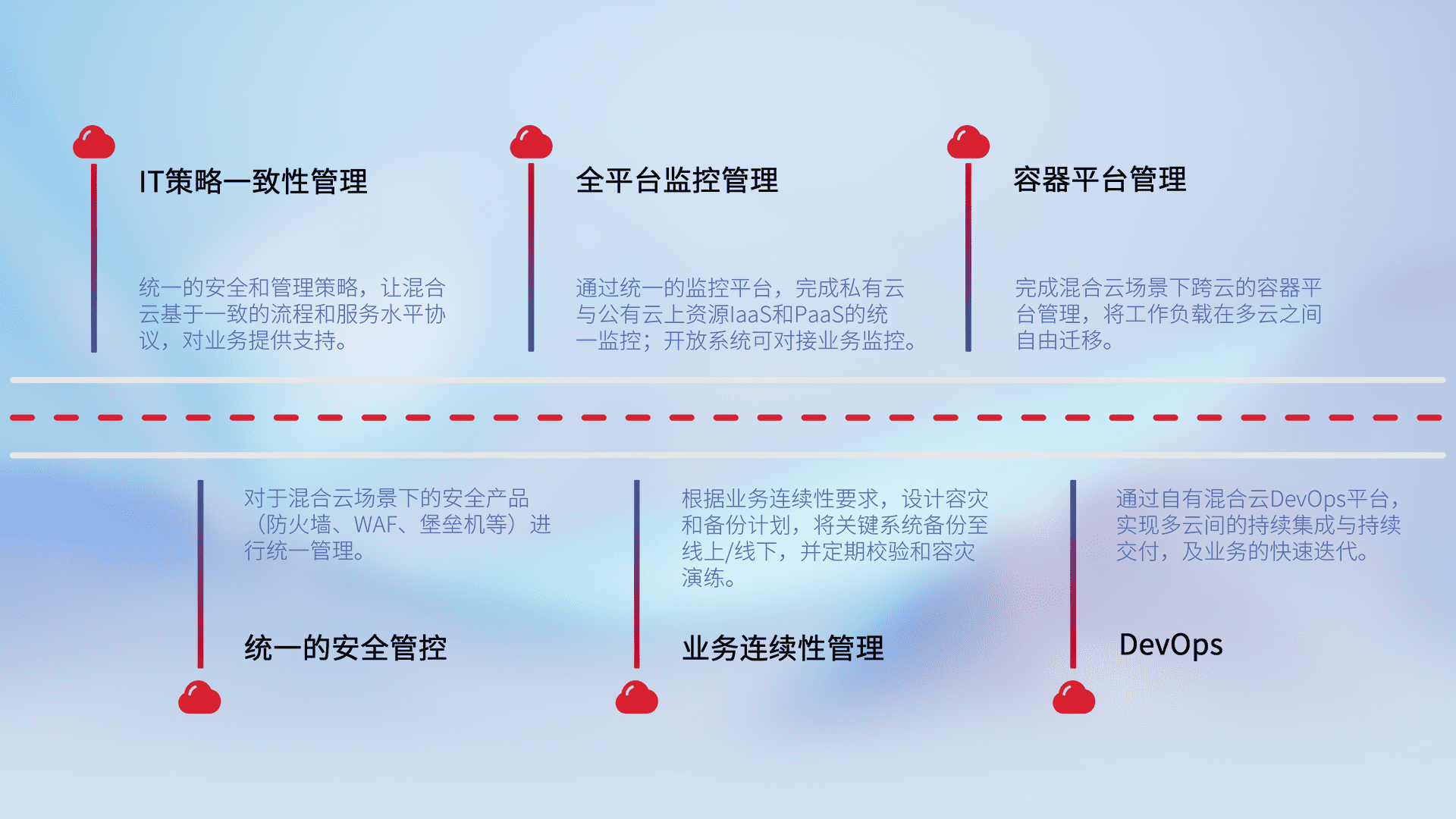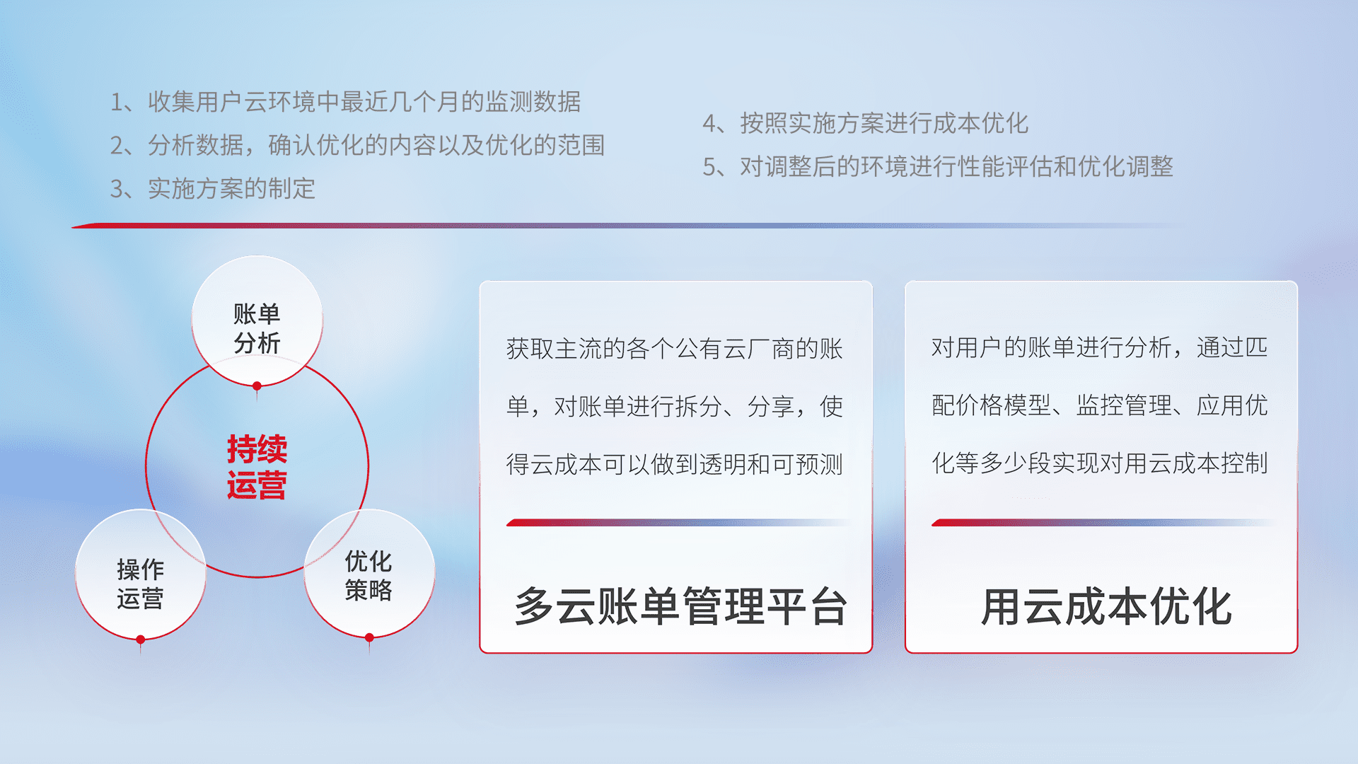 通过多云纳管,,,,以统一的资源数据模型把客户的云资源进行抽象和封装,,,,进而实现对多云资源的统一操作,,,,保障云资源管理的可靠性、、稳定性与可用性。。量身定制化运维内容,,,,配置、、、、开发运维、、、补丁管理、、、、备份、、、监控、、、、认证和访问管理、、、、审计和日常巡检等,,保障在用云过程中的可靠度,,稳定度以及高可用率。。。。